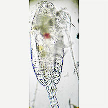 | Einige Vertreter des Planktons: a) Kieselalgen (auch: Diatomeen) haben ein Silizium-Außenskelett aus zwei Teilen, die wie die beiden Hälften eine Schachtel zusammenpassen. Hier die sehr große Art Kieselalge Coscinodiscus concinnus (Größe: 150-500µm). Sie tritt vorwiegend ab Frühsommer bis Hochsommer auf, wenn viel Licht und Nährstoffe ein rasantes Wachstum ermöglichen. Häufig bilden sie eine Schicht auf Meeresboden, Algen und Krebsen und können von Schnecken abgeweidet werden. Kieselalgen haben braune Chloroplasten für die Photosynthese. Der spezielle Bau weist auf eine besondere Art der vegetativen Vervielfältigung hin: die beiden Hälften trennen sich, eine jeweils kleinere (innere) Hälfte wird neu gebildet. Irgendwann ist die eine Hälfte der Kieselalge dadurch zu klein geworden, dann beginnt sie die sexuelle Vermehrung. Sinken Kieselalgen zu Boden, bilden die Schalen dort die sogenannte Kieselgur (Diatomeenerde), die in Wasserfiltern, reflektierenden Straßenmarkierungen oder als Scheuermittel in Zahnpasta Verwendung findet. - b) Der Ruderfußkrebs (Calanus helgolandicus) mit Größen zwischen 2,4 und 3,2mm hat einen kurzen Generationswechsel von nur einem Monat bei 7° kaltem Wasser. Er verdrängt durch die steigenden Wassertemperaturen in der zentralen Nordsee die größere Art Calanus finmarchicus (bis 5mm). Dies bedeutet eine Nahrungsverknappung für die Larven zahlreicher Fischarten, zum Beispiel des Kabeljaus. Ruderfußkrebse gehören sind die Tiergruppe, die in den Meeren am zahlreichsten vorkommt. Die kleinen Krebse spielen eine zentrale Rolle im Nahrungsnetz Meer: Sie fressen kleine Algen und dienen einer Vielzahl von Fischen, Meeressäugern und Vögeln als Nahrung, sind Bestandteil fast jeder Nahrungskette. - c) Der Dinoflagellat (Ceratium horridum) ist sehr klein: Der Durchmesser des Körpers liegt bei 40-50µm, inklusive Hörnern bis zu 400µm. Der Körperbau ist spannend: zweitgeteilt wie der der Kieselalgen, an der oberen Körperhälfte befindet sich ein langer Dornfortsatz (im Bild mittig), an der Unterseite zwei. Zusätzlich besitzen Ceratium Geißeln, die sich bewegen können. Eine Geißel bewegt sich in Spiralen (Lagestabilisierung), die andere wellenförmig (Vortrieb). Der Körper ist grün-bräunlich gefärbt von Chloroplasten, die mittels Photosynthese zur Ernährung beitragen. Phagocythose (Aufnahme von Nahrungspartikeln) ist ebenfalls möglich. Ceratium kann sogenannte 'Rote Tiden' hervorrufen bei massenhaftem Auftreten, sie sind allerdings nicht giftig. - d) Rogen (Fischeier), die kleinen Fischlarven sind kurz vor dem Ausschlüpfen. Vor allem die ausgeschlüpften Fischlarven vieler Fischarten gehören zum Plankton, bevor sie groß genug sind, Strömung und Wellen zu trotzen bzw. ihren späteren Lebensraum, z.B. den Meeresboden, aktiv aufzusuchen. |